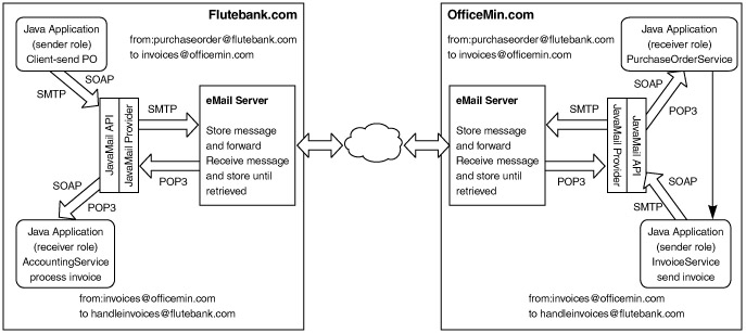 The above scenario shows how an asynchronous message-exchange scenario can be built using JavaMail and XML technologies. It is not necessary that Java be used on both sides. For example, OfficeMin could use Visual Basic or C++ to download email from its servers.