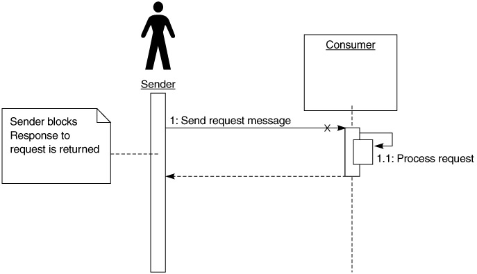Synchronous with response. The sender is blocked till the response to the message is received (Figure 11.22). This usually implements use cases corresponding to a read-only messaging pattern called synchronous-inquiry, in which data on the receiver's side is not changed as a result of the invocation. For example, the request contains a purchase order. The service processes that order and returns an invoice and shipping details.