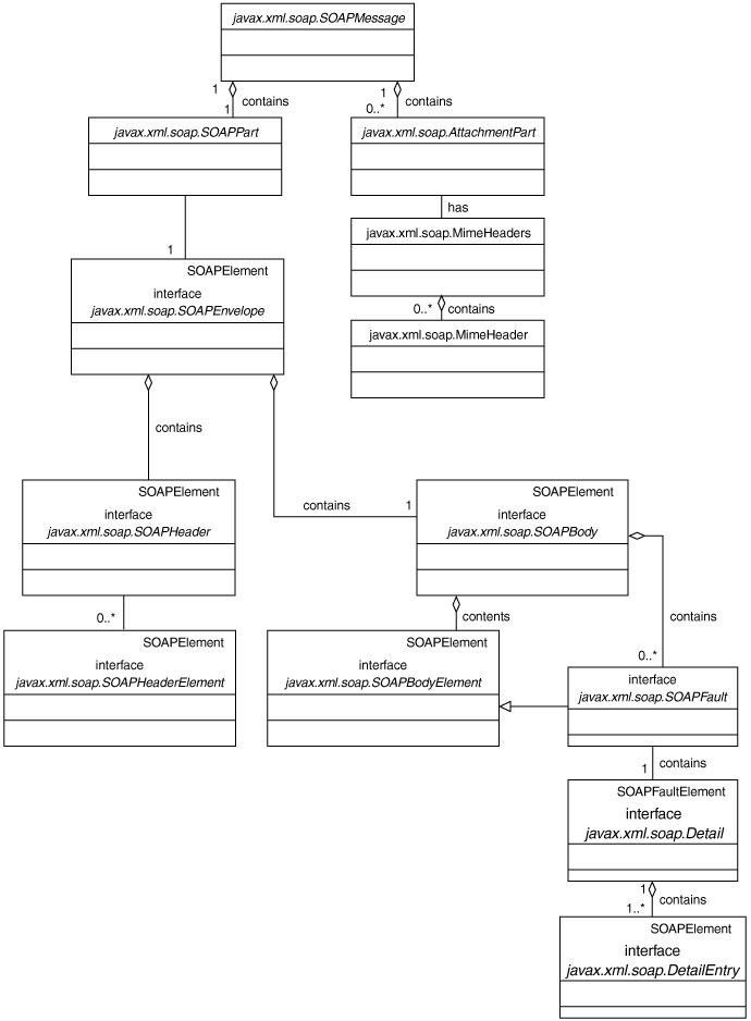 The SOAP specification does not provide a programming model or even an API for the construction of SOAP messages; it simply defines the XML schema to be used in packaging a SOAP message. The SAAJ specifications and the java.xml.soap package defines objects to construct and deconstruct a SOAP message and send them without the support of a provider. The SAAJ API introduced in Chapter 4 essentially provides a DOM-like tree representation of a SOAP message to developers. Figure 11.28 shows the relationships between the core objects in the javax.xml.soap package and how they model the physical SOAP message.