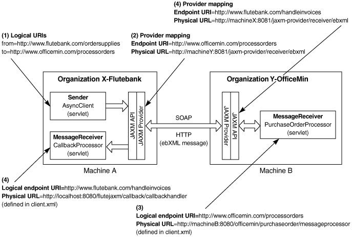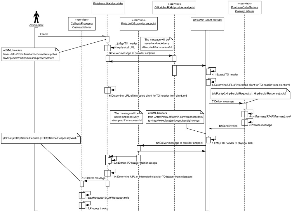 A similar descriptor must be deployed on the OfficeMin server. These mappings correspond to items 3 and 4 in Figure 11.33. To help the reader visualize the message exchange, Listings 11.12 and 11.13 show the underlying ebXML messages transmitted on the wire.