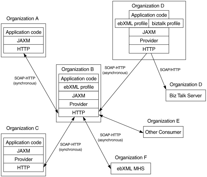 One approach to achieving reliable, asynchronous messaging is to provide a reliable messaging protocol at the SOAP level, such as ebXML. (See Figure 11.38.) Another approach is to use a higher level of abstraction, such as JMS, for its guaranteed delivery semantics. We discussed SOAP over JMS earlier in the chapter. In fact, the first generation of JAXM implementations are from JMS vendors such as Sun ONE MQ, BEA, and Sonic MQ, who have chosen the logical route of exposing their existing JMS messaging bus and infrastructure, using one of the following techniques from a high level: