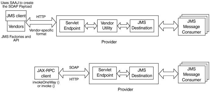 In the former approach, the wire-level message format and service implementation are specific to the vendor implementation. The latter is closer to the JAXM model, in that even though the server role is tied to a particular vendor implementation, the clients are not, and the service can be described as a traditional JAX-RPC service using WSDL.