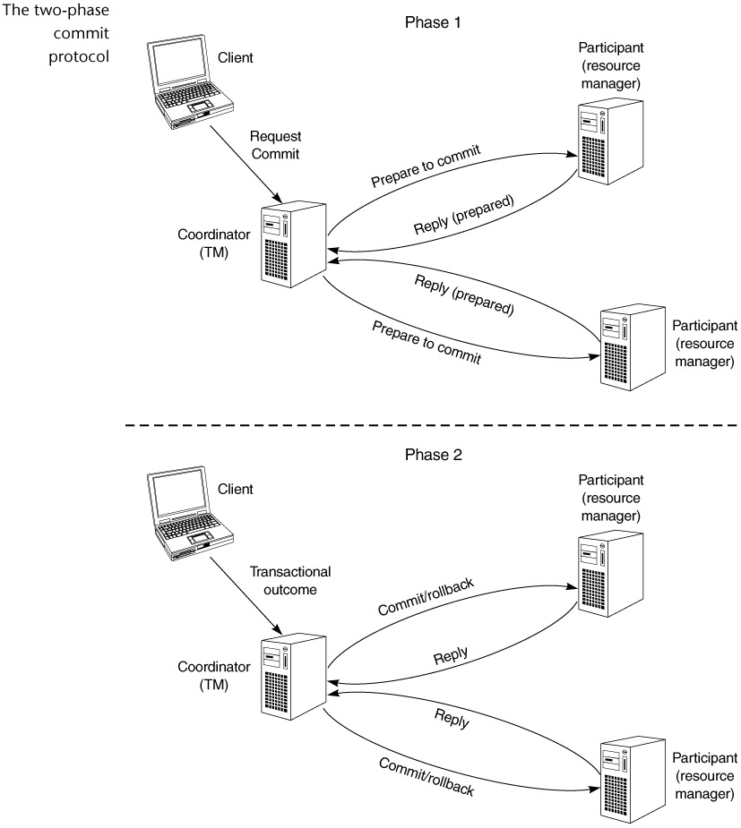 Global transactions span multiple resource managers. To coordinate global transactions, the coordinating transaction manager and all participating resource managers should implement a multiphased completion protocol, such as the two-phasecommit (2PC) protocol (Figure 14.1). Although there are several proprietary implementations of the this protocol, X/Open XA is the industry standard. Two distinct phases ensure that either all the participants commit or all of them roll back changes.