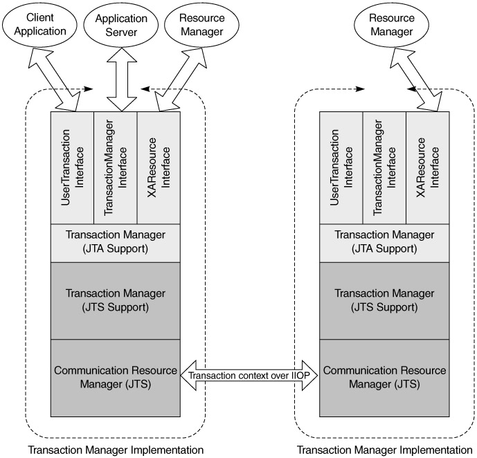 Within a JTS-compliant transaction manager implementation, a communication resource manager component handles incoming and outgoing transaction requests. Details of the interaction between the application server and a JTS transaction manager can be found in the JTS specification document.