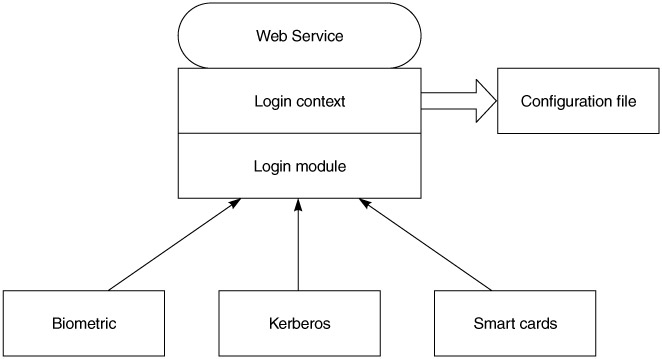 The Java Authentication and Authorization Service allows pluggable authentication (Figure 15.7) into an application, using several techniques. First, the authentication interfaces hide the complexity of the actual authentication mechanisms. Applications using this approach will not need to know nor care about what authentication protocol is in use. Second, JAAS allows authentication protocols to be stacked. In your Web service, you may require multiple authentication mechanisms be used before identity is established. As an example, accessing a payroll Web service may require a Kerberos login and a SQL server login. JAAS