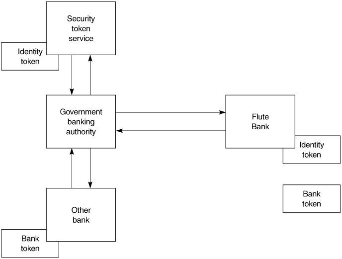 For example, the Flute Bank wire transfer Web service takes the approach shown in Figure 15.8. This scenario defines security token use. The bank's Web service interacts with other banks to transfer money on behalf of its customers. The service must validate that the receiving bank is certified by the government banking authority. This authority could go to the other bank, present its identity security token gathered from the Security Token Service, and request a security token from the other bank confirming that it is a government-certified bank. The government banking authority could then contact Flute Bank and provide both security tokens.