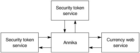 Many Web services will also use a federation model. Let us say that Annika, a customer of Flute Bank, wants to use a currency Web service at the First & Last Bank of Tunapuna (a company with which Flute maintains a relationship). The currency Web service allows only requests with a security token issued by Flute Bank. Annika's security token can be used only with identity claims. In this situation, Annika can access only the currency Web service, if the First & Last Bank of Tunapuna is willing to permit security federation with Flute Bank.