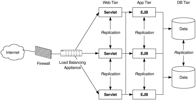 The above design also uses features built into many application servers, such as WebSphere, iPlanet, and others, to replicate state across members within a cluster. A multi-tier architecture creates fewer points of failure. If a server hosting a particular EJB fails, the servlet/JSP facilities are not affected. Introducing another level of separation also increases security. By providing separation, you can use firewall policies that allow access only to servlets/JSPs via HTTP.