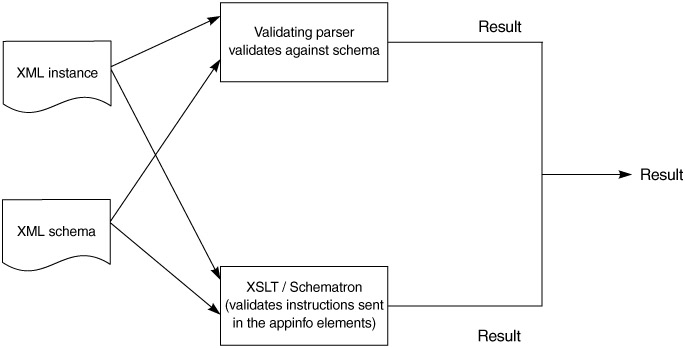 A sidebar earlier in the chapter discussed one way to extend an XML schema: by providing instructions to another tool, such as Schematron, in an appinfo element, we can get the other tool to provide validations that XML schema parsers cannot handle. The results from the two validations will need to be combined (see Figure A.6).