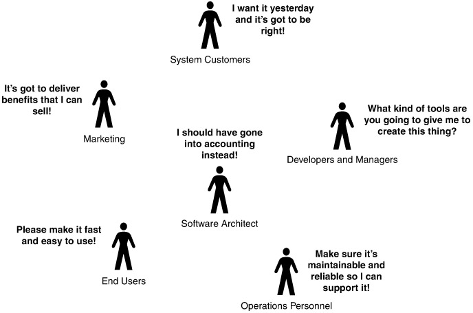 The system's customers want the system to be high quality, on budget, and on time. The development organization is looking for the products, frameworks, libraries, and tools from which they can create the system. The operations organization wants the system to be maintainable, configurable, and easily recoverable when something goes wrong. The marketing personnel are interested in how much functionality can be built into the system so they can sell the benefits to their customers. End-users want the system to be easy to use and perform well.
