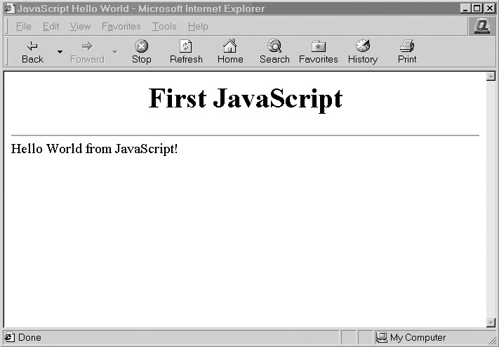 <!DOCTYPE html PUBLIC "-//W3C//DTD XHTML 1.0 Transitional//EN" "http://www.w3.org/TR/xhtml1/DTD/xhtml1-transitional.dtd"> <html xmlns="http://www.w3.org/1999/xhtml" lang="en"> <head> <title>JavaScript Hello World</title> <meta http-equiv="content-type" content="text/html; charset=utf-8" /> </head> <body> <h1 align="center">First JavaScript</h1> <hr /> <script type="text/javascript"> document.write("Hello World from JavaScript!"); </script> </body> </html>