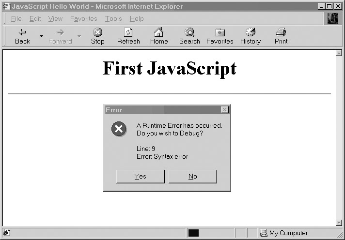 Using the <script> element allows the browser to differentiate between what is JavaScript and what is (X)HTML markup or regular text. If we type this example in using any standard text editor, we can load it into a JavaScript-aware Web browser such as Internet Explorer, Netscape, Mozilla, Opera, or many others, and we should see the result shown in Figure 1-1.