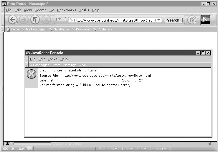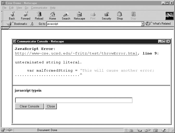 Under some browsers, notably versions 4 and above of Netscape, it is possible to gain access to a JavaScript console when typing in the URL javascript: by itself. Other browsers have a console that can be accessed to view errors and test code. However, Internet Explorer does not provide such direct access to the console, which can be used both for debugging and for testing the values of scripts. Examples of the JavaScript console are shown in Figure 1-6. |