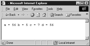 var w = 5; var x = 10; var y = "I am string "; var z = true; alert(w+x+y+z);