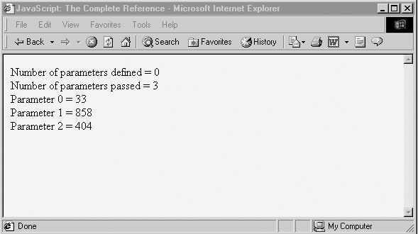 Of course, it is possible to vary the number of arguments actually given to a function at any time, and we can even accommodate this possibility by examining the arguments[] array associated with a particular function. This array is implicitly filled with the arguments to a function when it is invoked. The following example shows a function, myFunction, that has no defined parameters but that is called with three arguments: