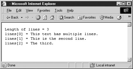 which uses the String method match() to break the text up into individual lines and places them in the array lines. (The global flag is set so that, as previously discussed, match() will find all occurrences of the pattern, not just the first.) The output of this example is shown here.