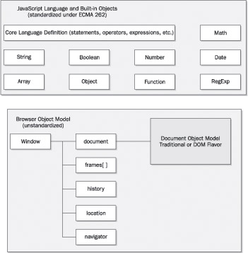 While it would seem clear, the unfortunate reality is that the division between the DOM and the Browser Object Model is at times somewhat fuzzy and the exact document manipulation capabilities of a particular browser’s implementation of JavaScript vary significantly. This section starts our exploration of the use of the various aspects of JavaScript object models that are fundamental to the proper use of the language. We begin this chapter with an exploration of JavaScript’s initial object model and then examine the various additions made to it by browser vendors. This apparent history lesson will uncover the significant problems with the “DHTML focused” object models introduced by the browser vendors and still used by many of today’s JavaScript programmers and will motivate the rise of the standard DOM model promoted by the W3C, which is covered in the following chapter.