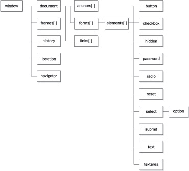 If you recall the history of JavaScript presented in Chapter 1, the primary purpose of the language at first was to check or manipulate the contents of forms before submitting them to server-side programs. Because of these modest goals, the initial JavaScript object model first introduced in Netscape 2 was rather limited and focused on the basic features of the browser and document. Figure 9-2 presents JavaScript’s initial object model that is pretty similar between Netscape 2 and Internet Explorer 3.