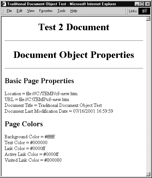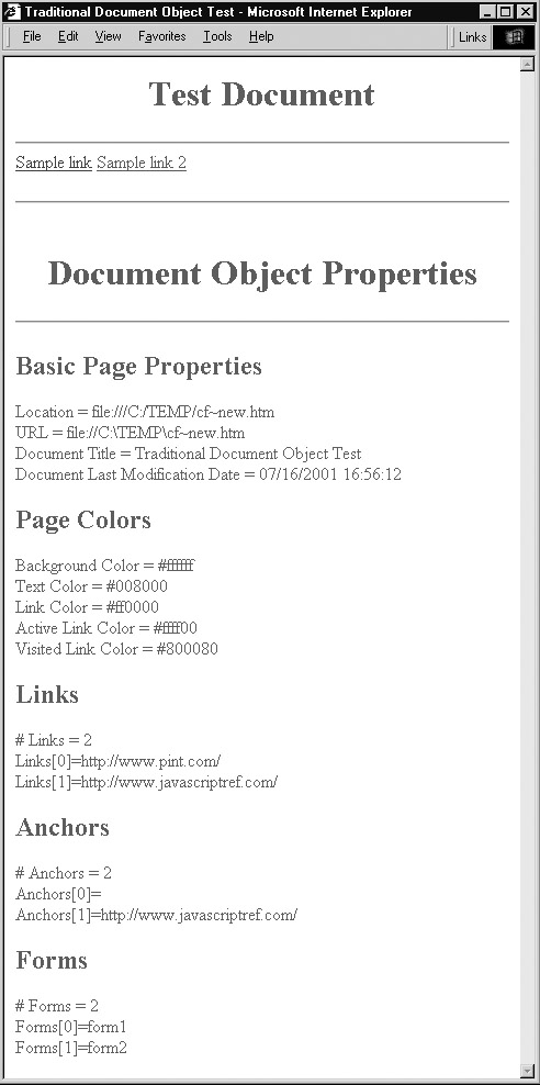 Examination of Tables 9-2 and 9-3 reveals that the early Document Object Model was very primitive. In fact, the only parts of a document that can be directly accessed are document-wide properties, links, anchors, and forms. There is no support for the manipulation of text or images, no support for applets or embedded objects, and no way to access the presentation properties of most elements. We’ll see all these capabilities are presented later, but first let’s focus on the most basic ideas. The following example shows the various document properties printed for a sample document.