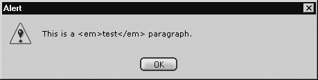 Internet Explorer also supports the innerText, outerText, and outerHTML properties. The innerText property works similarly to the innerHTML property, except that any set content will be interpreted as pure text rather than HTML. Thus, inclusion of HTML markup in the string will not create corresponding HTML elements. Setting para1.innerText = "<<b>>test<</b>>" will result not in bold text but rather with the string being displayed as “<<b>>test<</b>>.” The outerHTML and outerText properties work similarly to the corresponding inner properties, except that they also modify the element itself. If you set para1.outerHTML = "<<b>>test<</b>>", you will actually remove the paragraph element and replace it with “<<b>>test<</b>>”. The following example is useful if you would like to play with these properties.