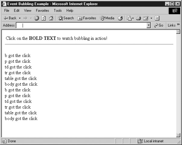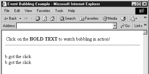 Clicking the bold text causes a click event to occur at the <<b>> tag. The event then bubbles up, invoking the onclick handlers off objects above it in the containment hierarchy. The result is shown in Figure 11-1.