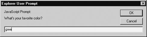 JavaScript also supports the prompt() method for the Window object. A prompt window is a small data collection dialog that prompts the user to enter a short line of data, as shown here: