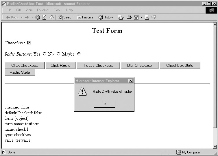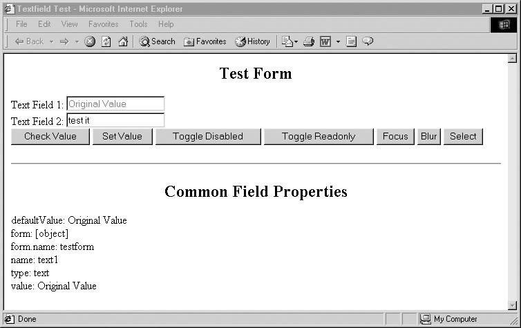 The next property that should be discussed is defaultValue. This property holds the string set by the value attribute in the original HTML file. So, given <<input type="text" name="testfield" value="First value" />> within the form named testform, the value of document .testform..testfield.defaultValue would be the string "First value." This will also be held in the property document.testform.testfield.value at first. However, as the user changes the contents of the field, the value property will change to reflect the user’s modifications, while the defaultValue property will remain constant. In fact, executing reset() on the form sets all the form’s elements’ values to their defaultValues. Interestingly, while it is obvious that value is changeable both by the user and by script, it turns out that defaultValue is also defined to be settable by script, though the value of this is not as obvious.