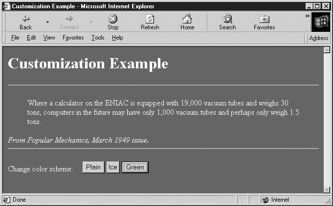 Cookies provide an easy way to create customized or personalized pages for individual users. The user’s preferences can be saved in cookies and retrieved by JavaScript code that modifies stylistic attributes for the page. While CGI scripts often use cookies to customize content, it is usually easier to modify style characteristics in JavaScript. The following example allows the user to select one of three color schemes for the page, as shown in Figure 16-6. While this particular example is rather simplistic, the basic concept can be used to provide very powerful customization features.