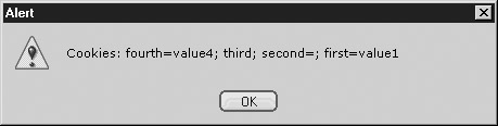 As you can see, it is possible for cookies to exist without explicit values. Additionally, the representation of the cookie named “second” is different under IE and Netscape. Though you should always use complete name/value pairs in the cookies set with JavaScript, some of the cookies the browser has might have been set by a CGI script over which you have no control. Therefore, it is always a good idea to write cookie-reading code to accommodate all possibilities. The extractCookies() function given in this section is a good example of the kind of defensive programming tactics that should be employed.