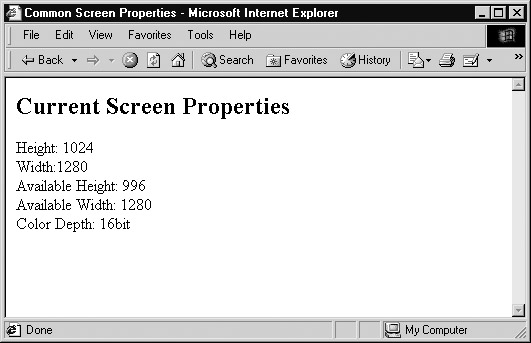 The Screen object is available in 4.x (and later) browsers and indicates the basic screen characteristics for the browser. It is actually a child of the Window object, although it would seem to make more sense as a parent of Window if you think about things logically. The following example shows the common screen characteristics that can be detected in browsers that support the Screen object.