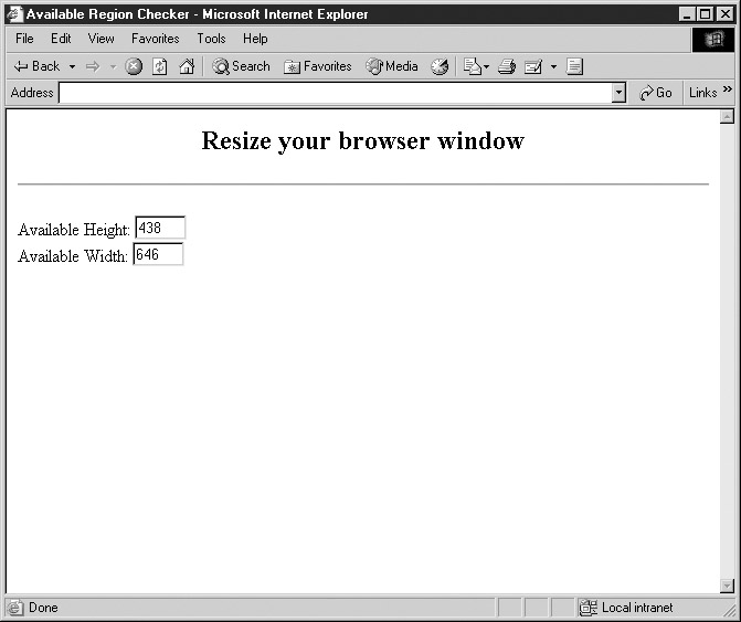 One thing that is rather troublesome with this detection is that the availHeight and availWidth properties indicate the height and width of the screen minus any operating system chrome rather than, as one might expect, the actual size of the available browser window. In order to detect actual window size, you have to use properties of the Window object in the case of Netscape. In the case of Internet Explorer, you need to look into the Document object and examine the body itself. However, in the case of the DOM, you might want to look at the size of the root element, namely, the <<html>> tag, and not the <<body>> if you are trying to get the dimensions of the window. Of course, which tag to look at depends on what rendering mode your browser is in, either loose or strict, which is generally determined by the doctype statement in the document. This example shows how you might check all this. Invariably, something might change given the lack of agreement among browser vendors on how to implement certain CSS, XHTML, and JavaScript ideas, but the example should still demonstrate the concept: