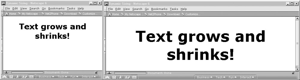 In browsers that permit manipulation of page content and styles at runtime, we can set the size of screen objects such as fonts in a manner appropriate to the current window size. Consider the following example, which works in Internet Explorer 5 and Netscape 6 or later.