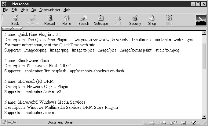 Part of the result in a typical installation of Mozilla-based browsers is shown in Figure 18-4. Of course, you can also access similar information by typing about:plugins in the location bar of Netscape and Mozilla-based browsers.