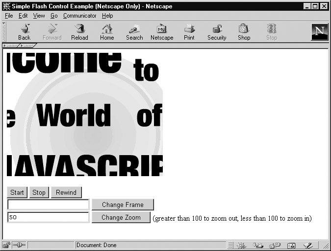 You can find a list of methods supported by the Flash player at Macromedia’s Web site (for example, at http://www.macromedia.com/support/flash/publishexport/scriptingwithflash/). The methods we will use in our simple example are GotoFrame(), IsPlaying(), Play(), Rewind(), StopPlay(), TotalFrames(), and Zoom(). The following example controls a simple Flash file extolling the wonders of JavaScript.