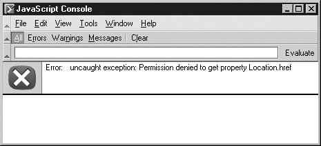 Because of the same-origin policy, the only way this script will work is if it’s loaded from www.google.com. If you load it from your own server, the attempt to access the Location object will fail because your domain doesn’t match www.google.com (or whatever domain the user happens to be visiting). The attempt to access the Location object will similarly fail if you save the script to your local disk and open it from there, but this time because the protocol doesn’t match (file:// versus http://). Internet Explorer 6 silently fails for this example, but the output in the JavaScript Console for Mozilla-based browsers is