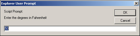 As you can see in the preceding code, our text is "Enter the degrees in Fahrenheit," and the default value in the input box is 50.