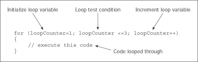 Following the semicolon, we have the test condition part of the for statement. The code inside the for statement will keep executing for as long as this test condition evaluates to true. After the code is looped through each time, this condition is tested. In Figure 3-10, we execute for as long as loopCounter is less than or equal to three. The number of times a loop is performed is often called the number of iterations.
