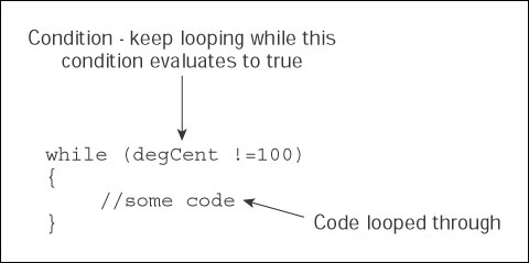 Whereas the for loop is used for looping a certain number of times, the while loop allows you to test a condition and keep on looping while it's true. The for loop is useful when you know how many times you need to loop, for example when you are looping through an array that you know has a certain number of elements. The while loop is more useful when you don't know how many times you'll need to loop. For example, if you are looping through an array of temperature values and want to continue looping while the temperature value contained in the array element is less than 100, you will need to use the while statement.