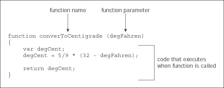 You should be pretty familiar with how the code in the function works. We declare a variable degCent, do our calculation, store its result in degCent, and then return degCent back to the calling code. The function's parameter is degFahren, which provides the information the calculation needs.