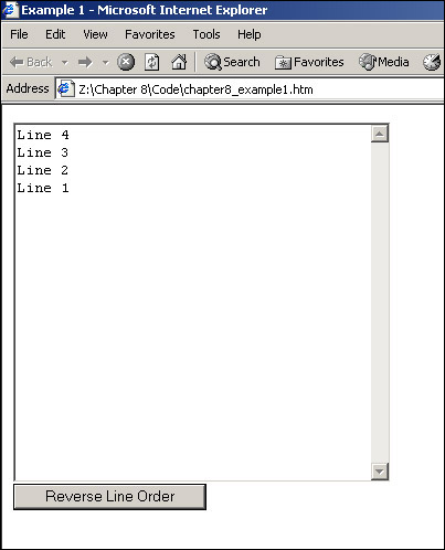<!DOCTYPE HTML PUBLIC "-//W3C//DTD HTML 4.01 Transitional//EN" "http://www.w3.org/TR/html4/loose.dtd"> <html> <head> <meta http-equiv="Content-Type" content="text/html; charset=utf-8"> <title>Example 1</title> <script language="JavaScript" type="text/JavaScript"> function splitAndReverseText(textAreaControl) { var textToSplit = textAreaControl.value; var textArray = textToSplit.split('\r\n'); var numberOfParts = 0; numberOfParts = textArray.length; var reversedString = ""; var indexCount; for (indexCount = numberOfParts - 1; indexCount >= 0; indexCount--) { reversedString = reversedString + textArray[indexCount]; if (indexCount > 0) { reversedString = reversedString + "\r\n"; } } textAreaControl.value = reversedString; } </script> </head> <body> <form name=form1> <textarea rows=20 cols=40 name=textarea1 wrap=soft>Line 1 Line 2 Line 3 Line 4</textarea> <br> <input type="button" value="Reverse Line Order" name=buttonSplit onclick="splitAndReverseText(document.form1.textarea1)"> </form> </body> </html>