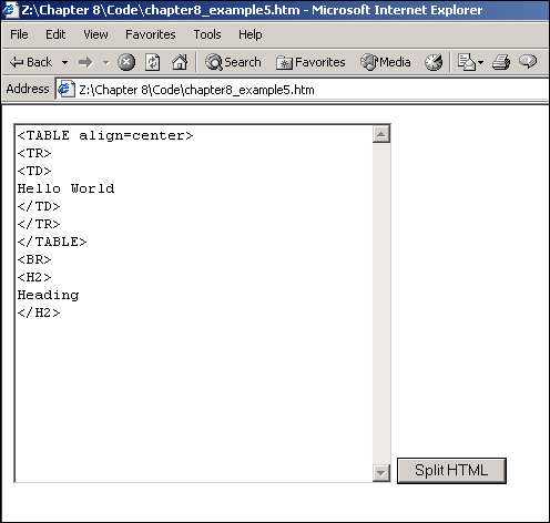 Save this file as ch8_examp5.htm. When you load the page into your browser and click the Split HTML button, a string of HTML is split, and each tag is placed on a separate line in the textarea, as shown in Figure 8-12.
