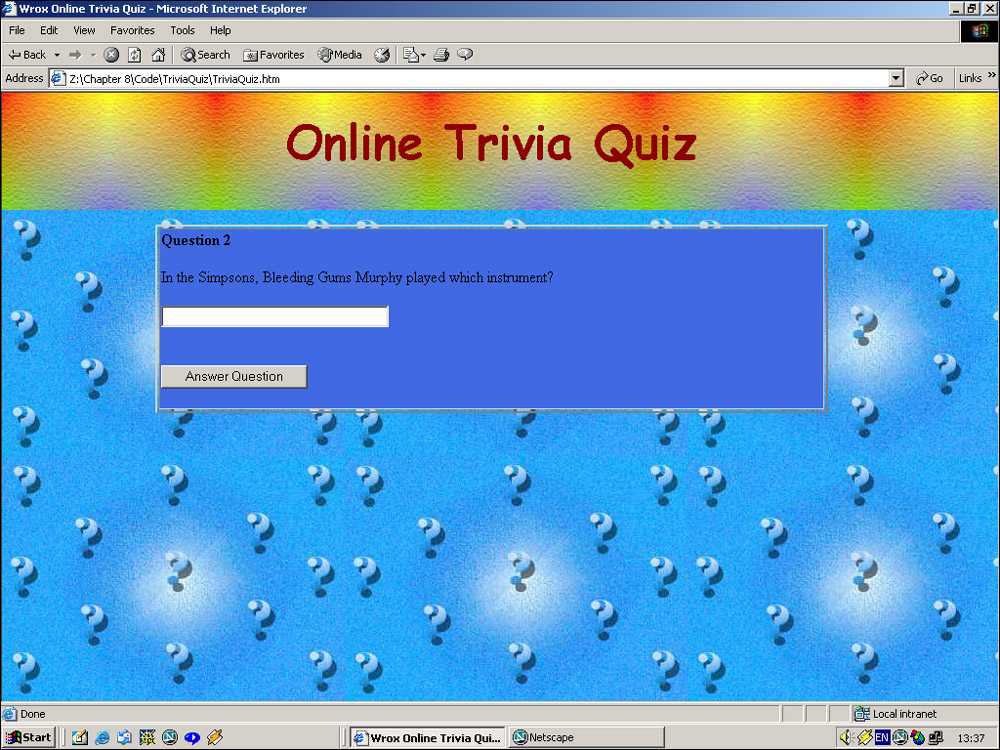Save the changes to the page. We're now ready to give our updated trivia quiz a test run. Load in TriviaQuiz.htm to start the quiz. You should now see the text questions displayed in Figure 8-13.