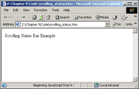 Save the page as scrolling_status.htm and load it into your browser. In the status bar at the bottom of the browser's window, you'll see this scrolling message: Beginning JavaScript from Wrox Press.