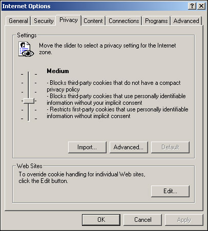 IE6 has introduced a new security policy for cookies based on the P3P recommendations made by the World Wide Web Consortium, or W3C for short, a web standards body that deals with not only cookies but html, XML, and various other browser standards. Their website is at www.w3c.org and contains a host of information, though it's far from being an easy read. The general aim of P3P is to reassure users who are worried that cookies are being used to obtain personal information about their browsing habits. In IE 6 under the Tools ® Internet Options, select the Privacy tab to see where we can set the level of privacy with regards to cookies. (See Figure 11-16.) It's a balance between setting it so high that no website will work, or too low and run the risk of having your browsing habits recorded and potentially personal data stored: