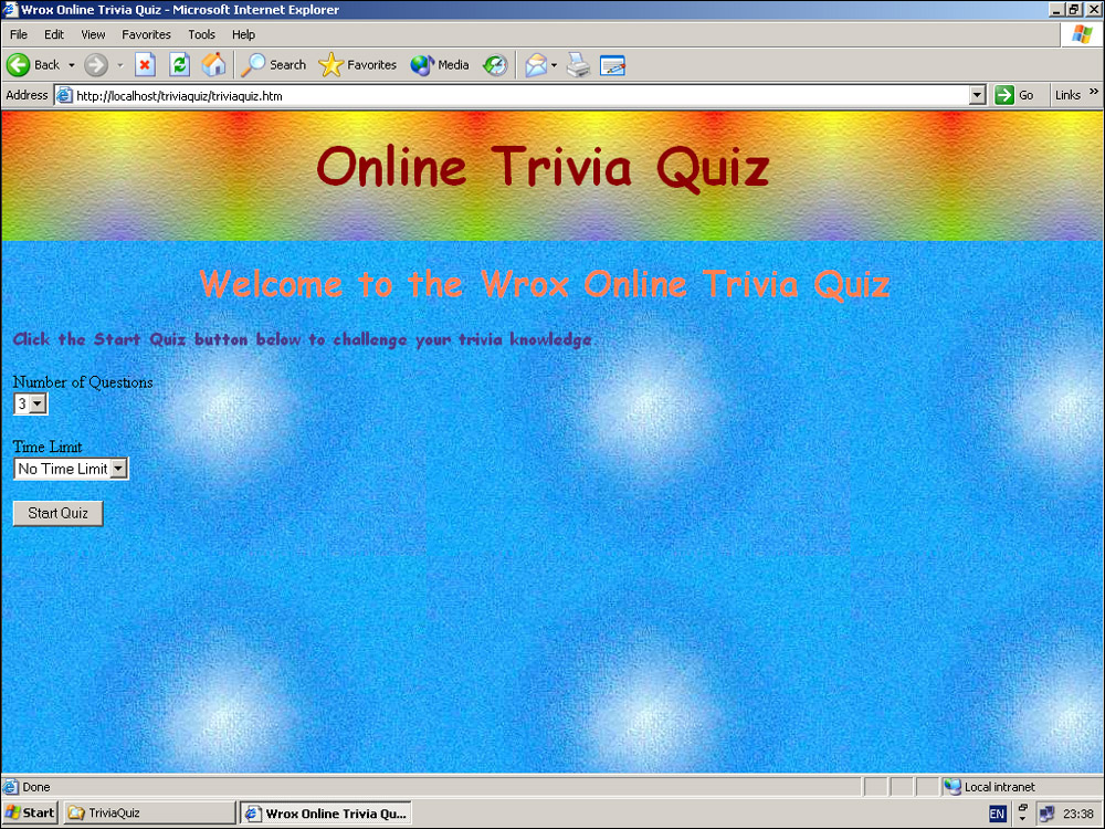 Figure 16-40 is the start page for the trivia quiz, where the user selects the number of questions to answer and in what time limit. If the user changes the default values, completes the quiz, and then asks to restart the quiz, we want to return to this page with the options the user selected previously; at present the default values are shown each time. The users can change previous selections if they wish, and if they do so, these changes will be noted the next time they restart the quiz. Although not a major innovation of interface design, it does make the quiz just that little bit more user-friendly.