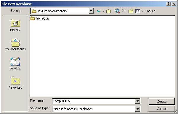 The dialog box shown in Figure 17-2 then allows us to pick a file name and location for the new database. It enters db1.mdb as a suggested name for the database. Change this to CompBitsCo.mdb and place it in the AWalkOnTheServerSide virtual directory and click Create.