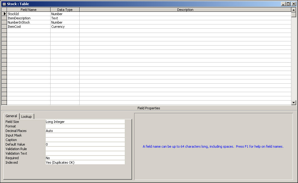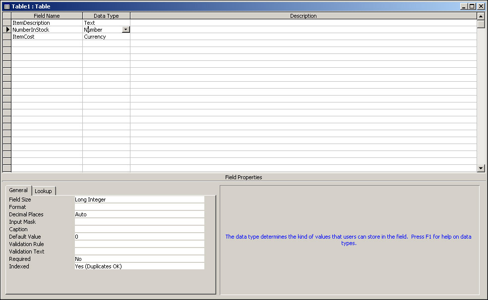Although each field has a data type, this data type itself has various properties, which are shown under the General tab in the bottom left of the screen. Where these properties need to be changed I'll point it out, otherwise we can leave them at their default values.