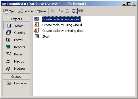 Let's create these tables in Access as we did for the Stock table. Within Access, make sure that Tables is selected under Objects, as shown in Figure 17-6.