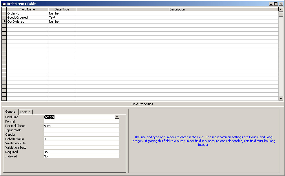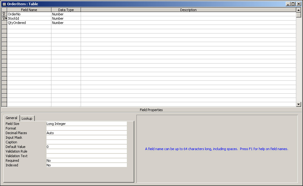 We need to change the OrderItem table to reflect the changes made in the Stock table. View the OrderItem table in design view. We need to change the name of the GoodsOrdered field to StockId and its data type from Text to Number with a field size of Long Integer. Why Long Integer and not AutoNumber? Information for this field will be taken from the StockId field of the Stock table and will not be created independently of it.