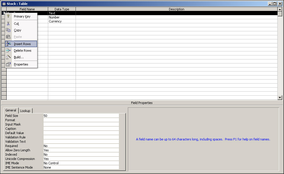 Let's create a new Access database and add the stock table discussed previously.